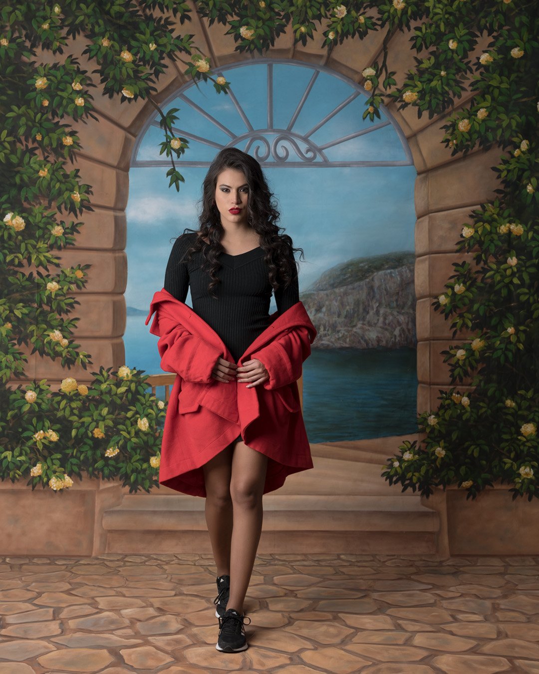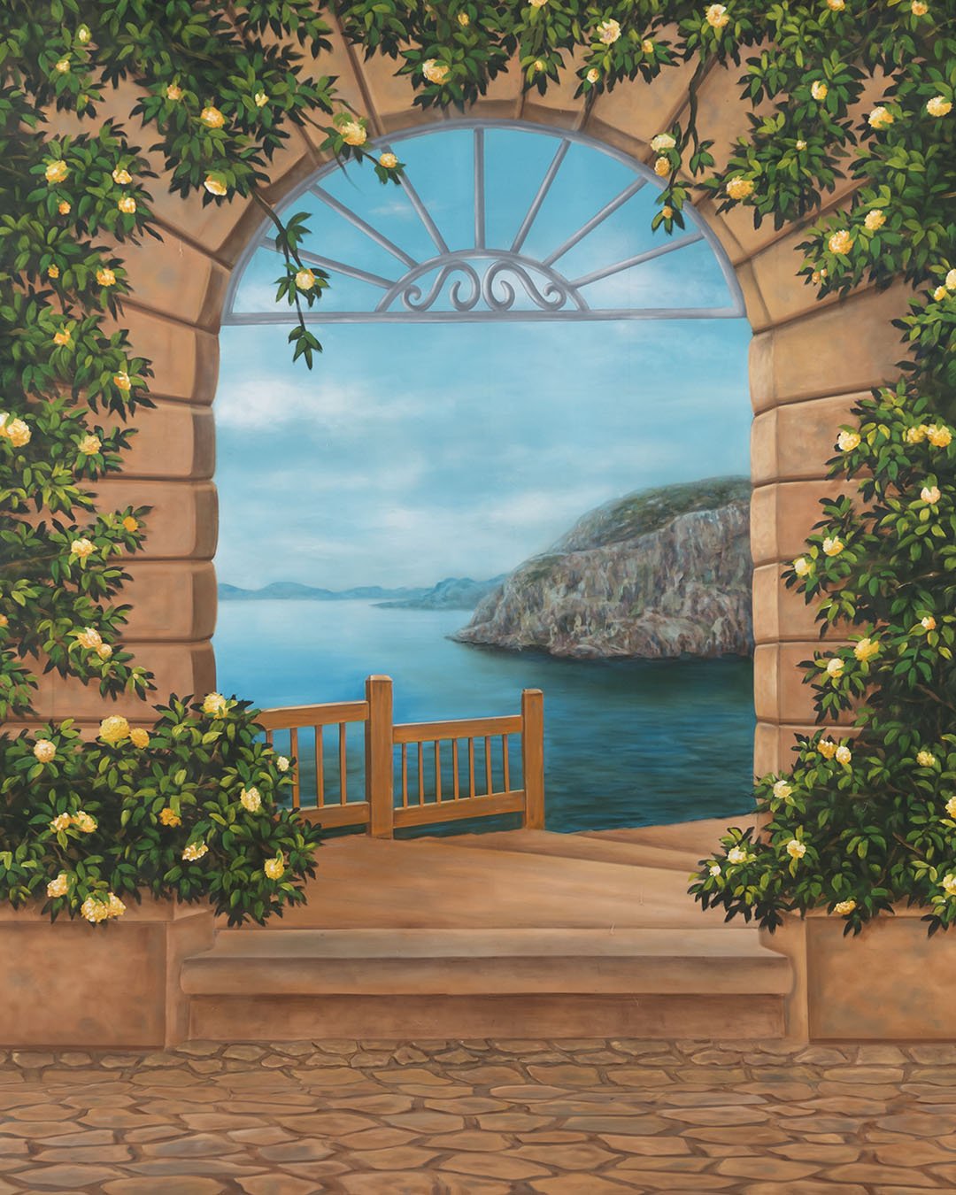 Baroque Studio Amalfi Door 3D Scenic photo video backdrop is a 3D scenic background. This backdrop is perfect for both photography and videography as it is an immersive studio background. It has been hand-painted by experienced artists with precision. The photo video backdrop depicts a window surrounded by vines looking out towards a cliff.